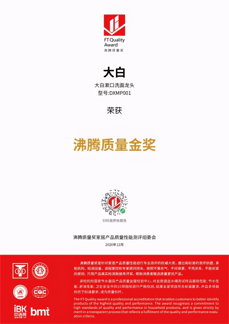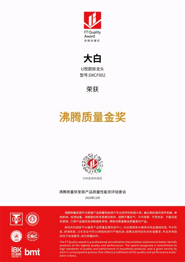 厦门大白从13大家居品类、195家参评品牌、396款参评产品中锋芒毕露,一举拿下四项质量大奖,其间三款参评产品荣获「欢腾质量金奖」。据悉,欢腾质量金奖是欢腾质量奖测评中颁布的最高奖项,代表了该品类当时质量顶配水平。参与欢腾质量奖综合奖全项测评,一切项目都到达规范要求以上,各项功能指标杰出,而且总得分名列同批样品前十名才有时机获此荣誉。